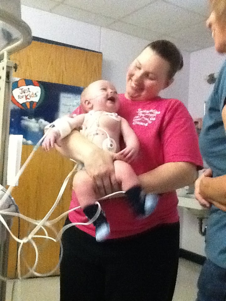 Oh! One more update. Last week we met with the neonatal team. They did a bunch of little tests to check his development. Because of his condition, and the surgeries/recoveries he's gone through, he's not quite where the typical child is on the development chart. But the docs are very pleased with his development so far. They say he's close to where he should be (given his heart issues). He started to roll over! He tends to get stuck on his arm when he tries to go from back to front, but that's getting better. The front-to-back roll is still kind of spastic, but at least they're happening! He's getting better at sitting on his own, too. He can do it, but his stomach muscles aren't quite strong enough to hold him up and keep him from tumping. He has never been a fan of "tummy time" (something pretty common for heart babies), so he hasn't really developed those muscles. We're trying TT a few times a day for as long as he'll stand it - sometimes 5-10 minutes, sometimes the amount of time it takes for you to lay him down). He is low on the growth chart, though (also common for heart babies). Our main goal before the next appointment is to get him up towards the 50th percentile. They changed the way we mix his formula to help him gain weight. Now he's getting 27 calories per ounce (as opposed to the 24 we were making. Formula as-is is 20 calories)! It's a bit thicker, and we go through formula like you would not believe! We're using a canister every 2 days!!